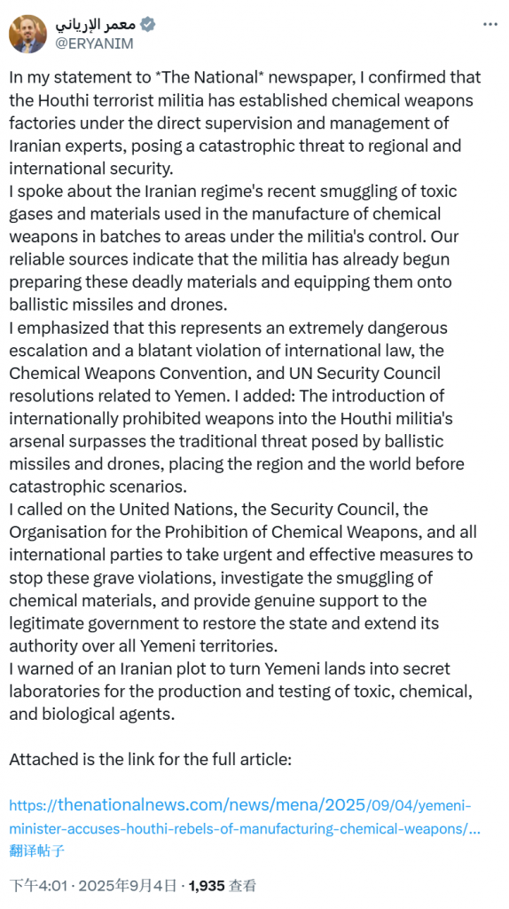 也门信息部长穆阿迈尔·艾里亚尼(Moammar Eryani)在9月4日接受《The National》采访时表示:“胡塞恐怖民兵在伊朗专家直接监督和管理下,建立了化学武器生产工厂”,并称伊朗近期分批走私有毒气体与相关材料进入胡塞控制区;他还说情报显示这些材料已被装载到弹道导弹与无人机上。随后他在 X 平台发帖再次确认系自己对《The National》的表述。国家报
