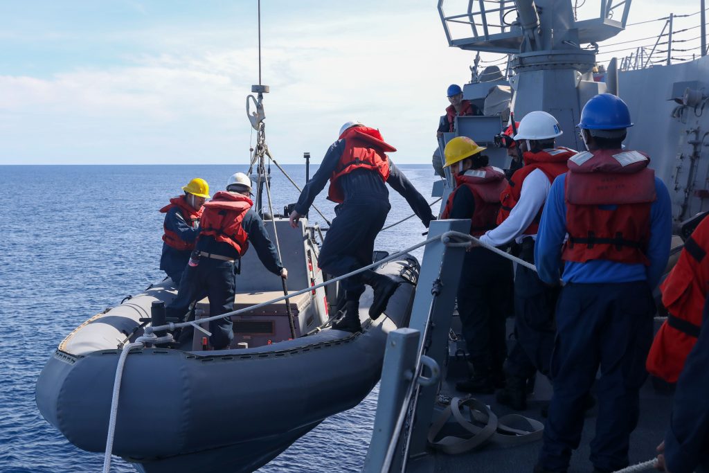 南中国海(2025年9月13日)——“Arleigh Burke”级导弹驱逐舰 USS John Finn (DDG 113) 上的水兵在与 Osumi 级战车登陆舰 JS Osumi (LST-4001) 和 Jose Rizal 级护卫舰 BRP Jose Rizal (FF-150) 开展海上协作活动期间,执行小艇作业并放下一艘硬式充气动力艇(RHIB)。John Finn 处于前沿部署状态,隶属第15驱逐舰中队(DESRON 15),这是美国海军规模最大的驱逐舰中队,也是美国第七舰队的主要水面作战力量。(美国海军图片,摄影:二级大众传播专家 Alexandria Esteban)