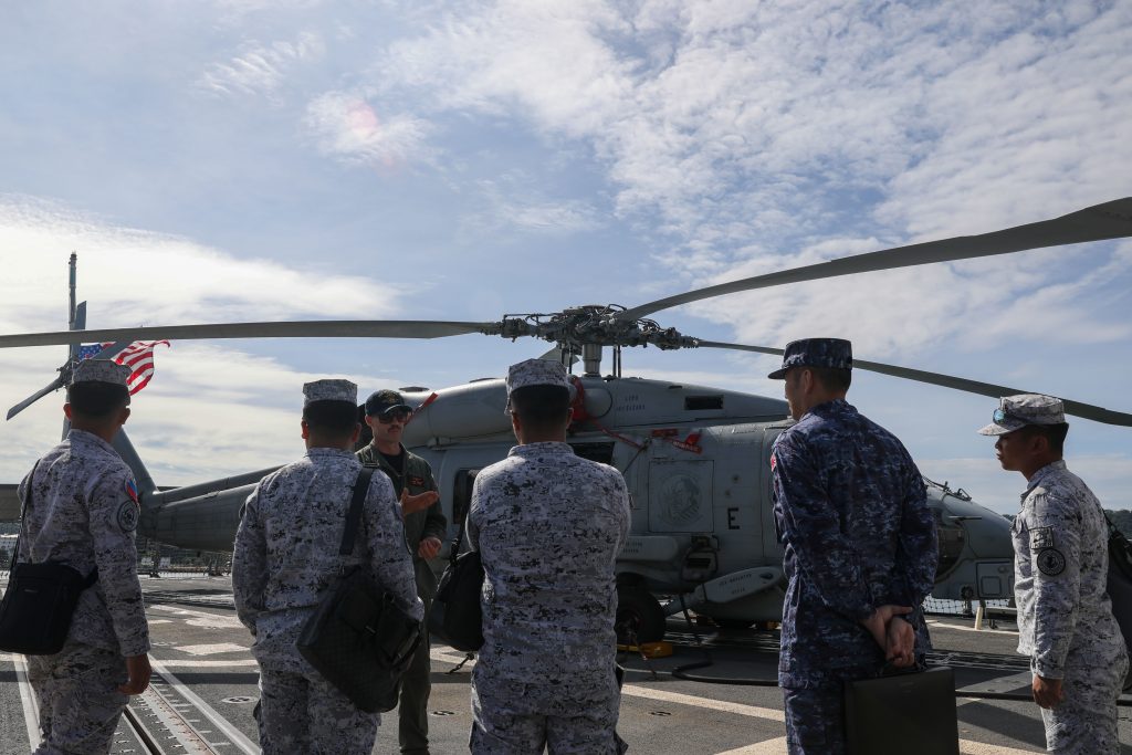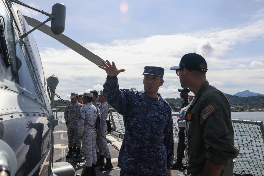 苏比克湾,菲律宾(2025年9月11日)——来自华盛顿州塔科马的 Lt. Sam Melin 在 Arleigh Burke 级导弹驱逐舰 USS John Finn (DDG 113) 的飞行甲板上,向菲律宾海军官兵以及日本驻菲律宾助理国防武官 Cmdr. Noriyuki Kawahata 讲解飞行甲板作业流程。该活动为“坚决之龙”科目交流的一部分,地点位于菲律宾苏比克湾,时间为9月11日。John Finn 前沿部署,隶属 DESRON 15——美国海军规模最大的驱逐舰中队,也是美国第七舰队的主要水面作战力量。“坚决之龙 25”是每年在日本(包括西南诸岛)举行的双边演习,重点提升第三海军陆战远征军(III MEF)与日本陆上自卫队西部方面队人员的指挥控制和多域机动能力,聚焦关键海上地形的控制与防卫。(美国海军图片,摄影:二级大众传播专家 Alexandria Esteban)