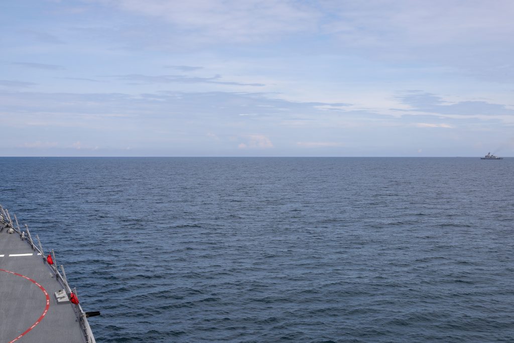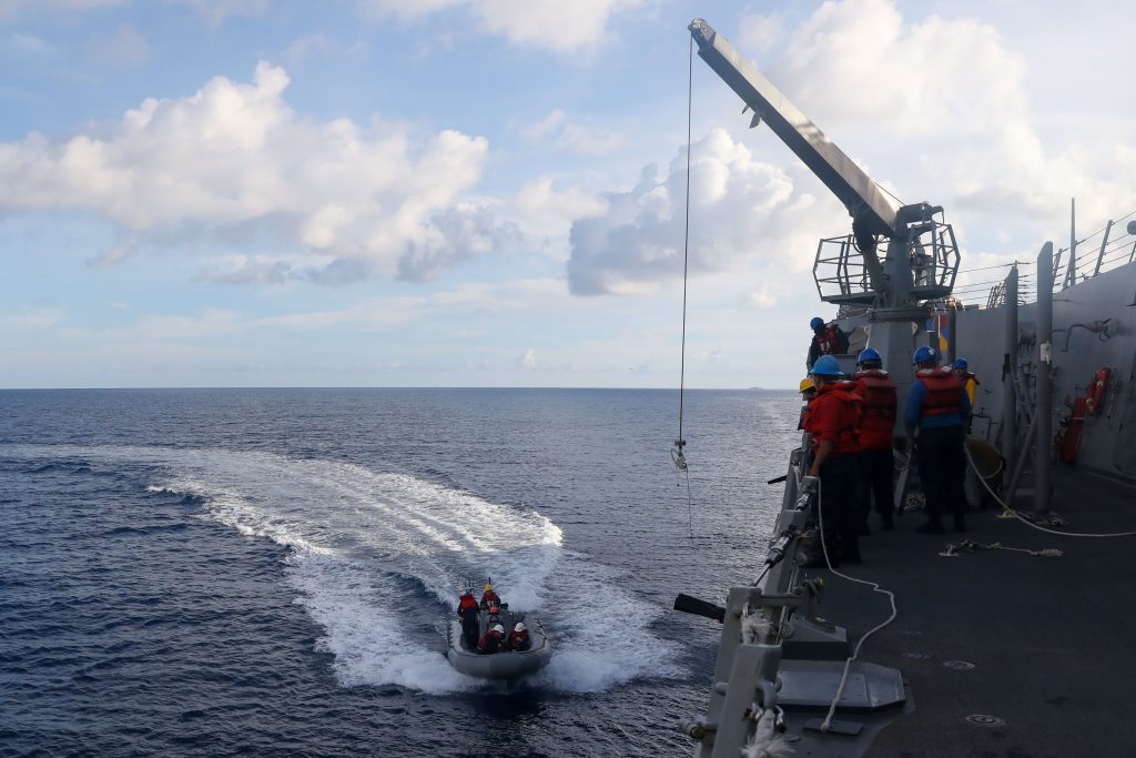 南中国海(2025年9月13日)——“阿利·伯克”级导弹驱逐舰 USS John Finn (DDG 113) 上的水兵在与 Osumi 级战车登陆舰 JS Osumi (LST-4001) 和 Jose Rizal 级护卫舰 BRP Jose Rizal (FF-150) 开展海上协作活动期间,执行小艇作业。John Finn 前沿部署,隶属 DESRON 15,该中队为美国海军规模最大、亦为美国第七舰队的主要水面作战力量。(美国海军图片,摄影:二级大众传播专家 Alexandria Esteban)