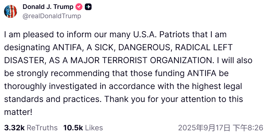 【路德时评|剪辑】川普总统发Truth Social,宣布将 ANTIFA 指定为主要恐怖组织并彻底调查 9/17/2025