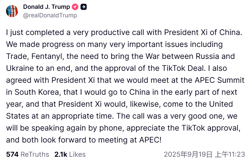 我刚刚与中国国家主席习近平进行了非常富有成效的通话。我们在许多非常重要的问题上取得了进展,包括贸易、芬太尼、需要结束俄乌战争,以及批准 TikTok 交易等。我还与习近平主席达成一致:我们将在韩国举行的 APEC 峰会上会面;我将在明年年初访问中国;而习近平主席也将在适当的时候访问美国。这次通话非常顺利,我们还将再次通过电话交谈;我对 TikTok 交易获批表示感谢,双方都期待在 APEC 见面!
