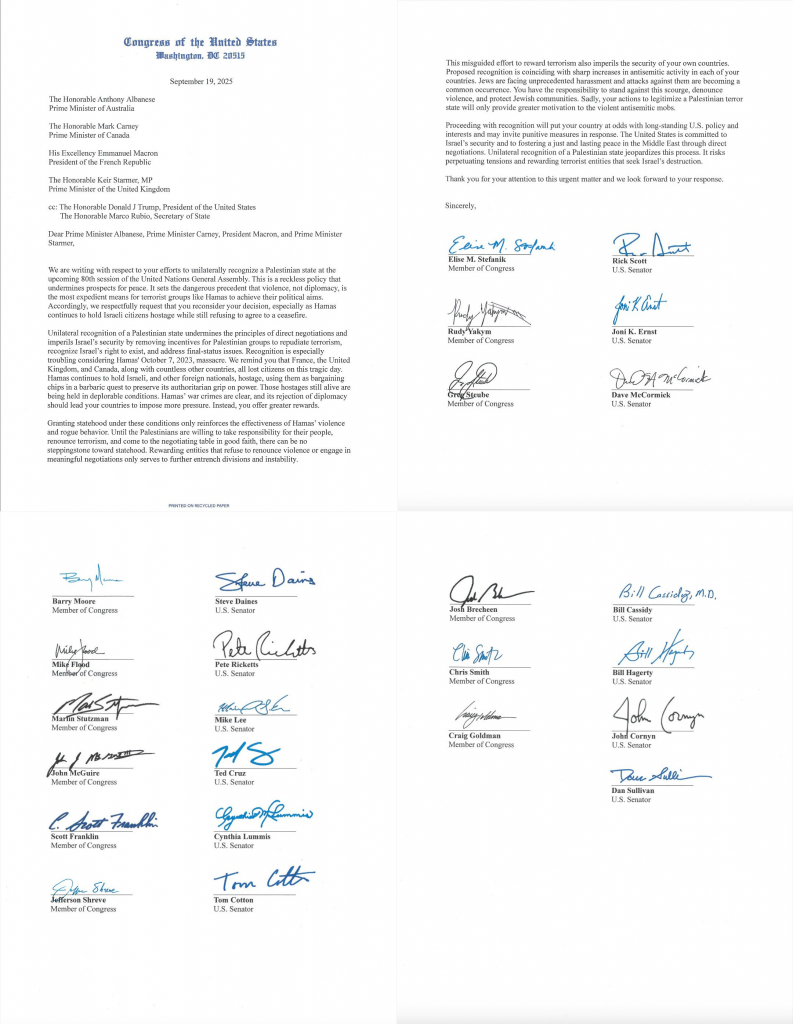 华盛顿特区——今日,众议院共和党领导层主席埃莉丝·斯特凡尼克与里克·斯科特参议员(佛罗里达州共和党)致信美国盟友法国、加拿大、英国和澳大利亚,敦促其在联合国大会上回撤立场,拒绝对巴勒斯坦国的单方面承认;该举措将使哈马斯受益、危及以色列的安全,并堵死通过谈判实现和平的道路。