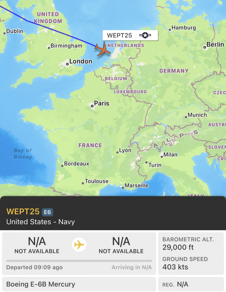 9月22日(美东时间),多家开源航迹与航空媒体显示,一架美海军 E-6B“水星”战略通信机以呼号 WEPT25(先前一度显示为 WEPT45)自俄克拉荷马州廷克空军基地起飞,穿越大西洋进入欧洲方向,航迹接近英国后大概率续飞德国拉姆施泰因空军基地。这类飞机通常在美国本土执行任务,跨洋外展较为少见,因而引发关注。其应答机十六进制代码亦被开源观察者记录为 AE041C 与 AEDAA5。目前美军未就此次行动发布官方通报。