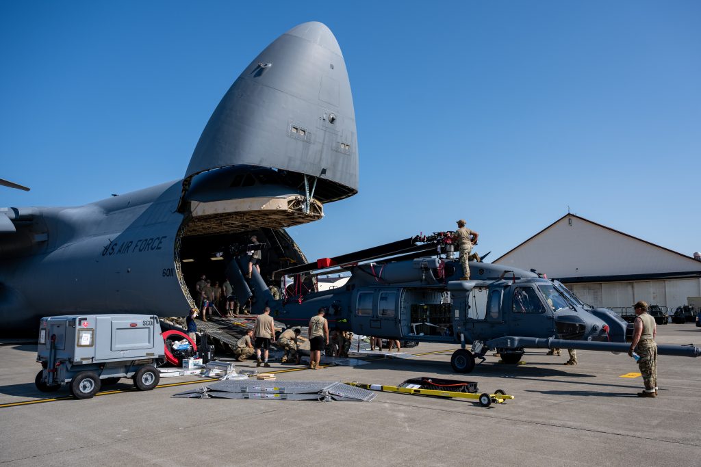 2025年8月3日,日本三泽空军基地:“坚定力量·太平洋2025”演习期间,隶属第106救援联队与第22空运中队的官兵将一架HH-60W“欢乐绿巨人II”直升机装载进一架C-5M“超级银河”运输机。