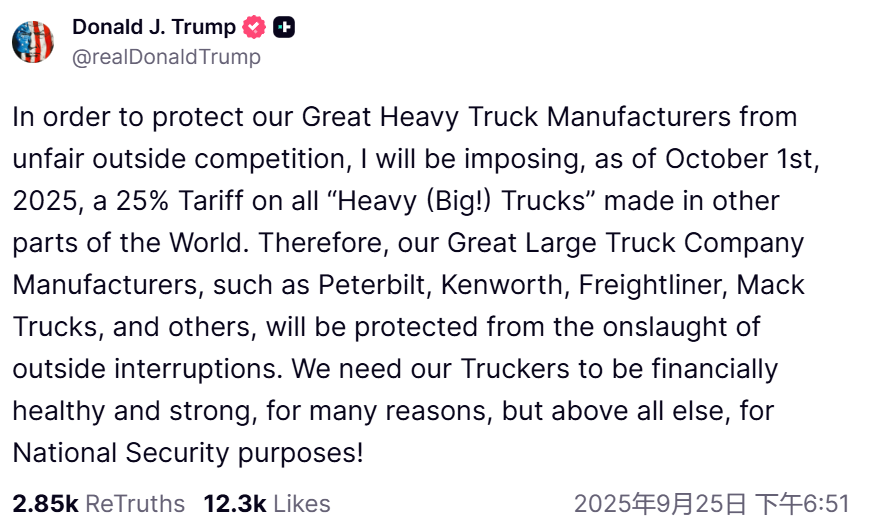 川普总统:自2025年10月1日起,对重型卡车征收25%关税