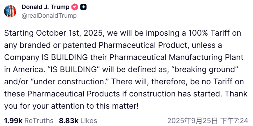 川普总统:自2025年10月1日起,我们将对任何品牌药或专利药品征收100%关税