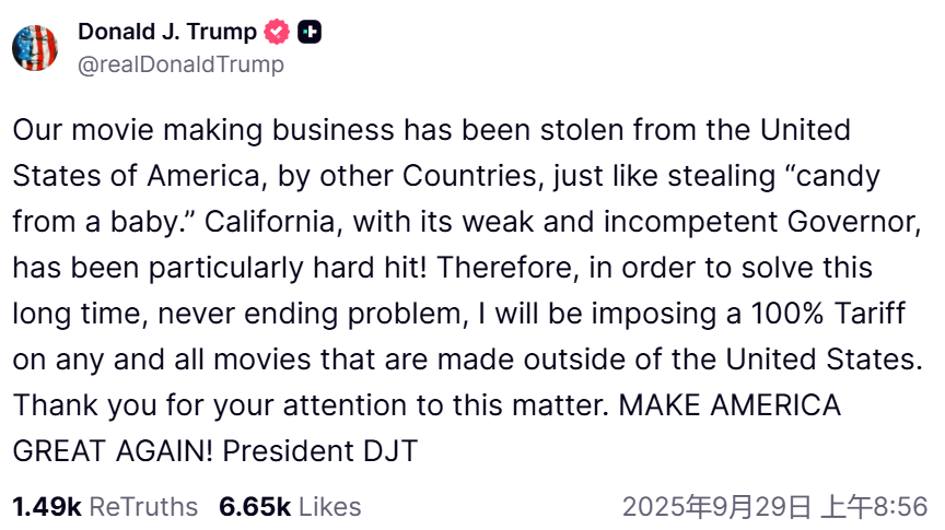 我们的电影制作业已经被其他国家从美利坚合众国偷走了,简直就像“从婴儿手里抢糖果”。加利福尼亚州在其软弱无能的州长领导下,受到的打击尤为严重!因此,为了解决这一长期、没完没了的问题,我将对所有在美国境外制作的电影一律征收100%的关税。感谢各位对此事的关注。让美国再次伟大!——美利坚合众国总统 唐纳德·J·川普
