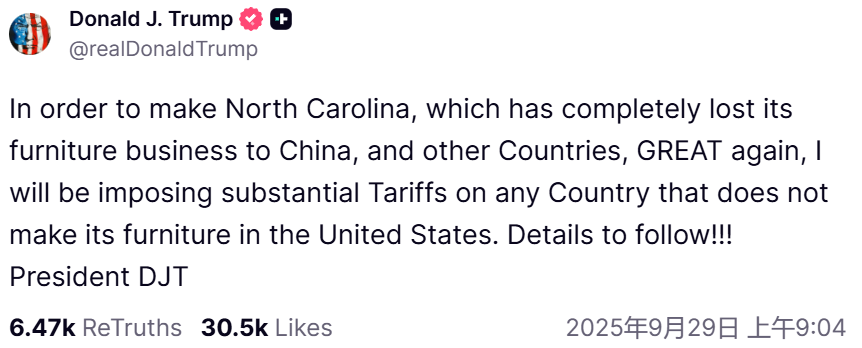 为了让北卡罗来纳州(其家具业已完全被中国和其他国家抢走)再次伟大,我将对任何不在美国生产家具的国家征收高额关税。详情稍后公布!!!—— 美利坚合众国总统 唐纳德·J·川普