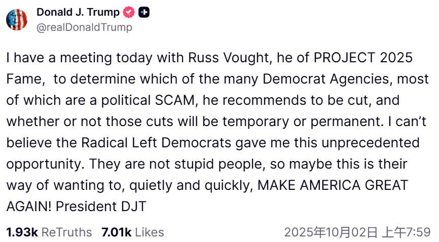 今天我要会见因“2025计划”而知名的拉斯·沃特,商定他建议削减哪些由民主党人主导的诸多机构——其中大多数不过是政治骗局——以及这些削减是暂时性的还是永久性的。我简直不敢相信,激进左翼的民主党人给了我这个前所未有的机会。他们并不愚蠢,所以也许这就是他们想要悄悄而迅速地让美国再次伟大的方式!——美利坚合众国总统 唐纳德·J·川普