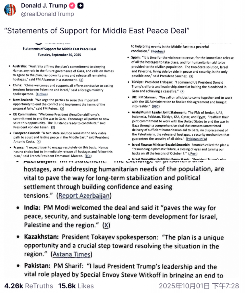 总统雷杰普·塔伊普·埃尔多安表示:“我赞赏美国总统川普为停止加沙流血并促成停火所作的努力与领导。”