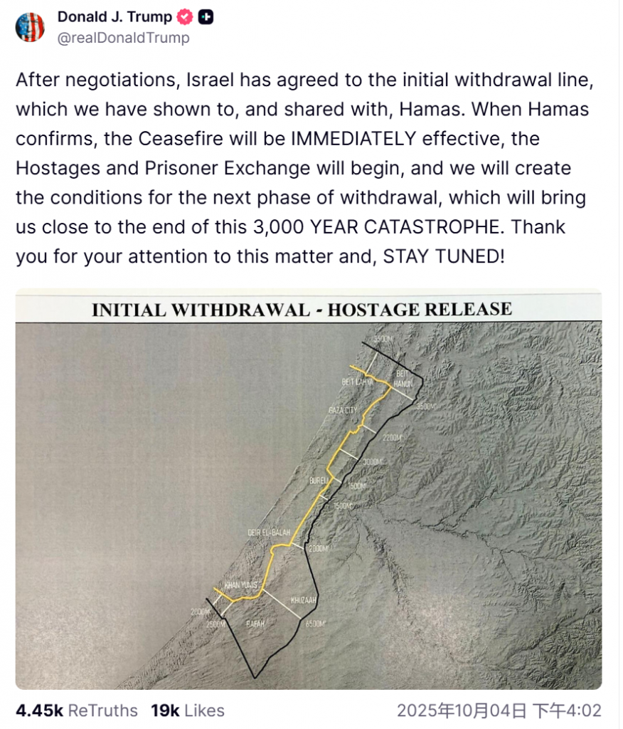 川普总统:已将初步撤军线展示并与哈马斯共享,一旦哈马斯确认,停火将立即生效,人质与囚犯交换将启动