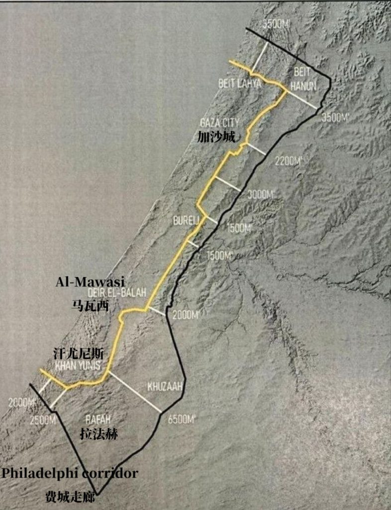 据称这是川普总统提出的最新撤离示意图。黄色线为以军撤至的边界,以便在协议第一阶段实施人质释放。