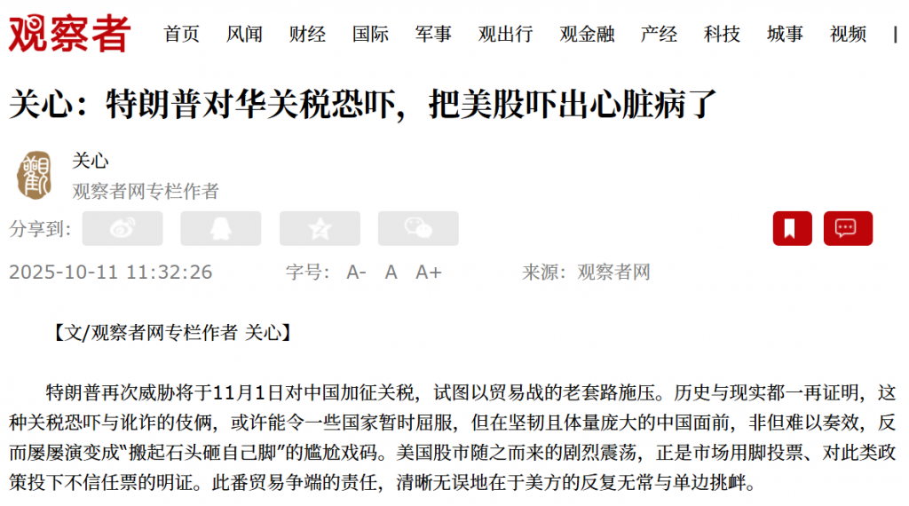 中共观察者网刊文《关心:特朗普对华关税恐吓,把美股吓出心脏病了》