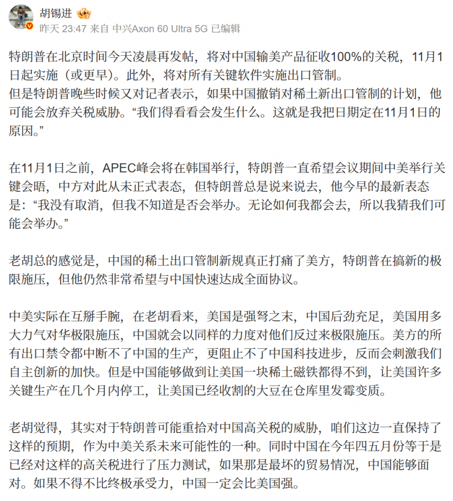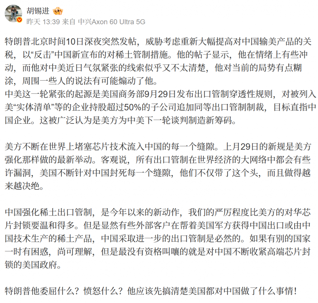 胡锡进:中国的稀土出口管制新规真正打痛了美方