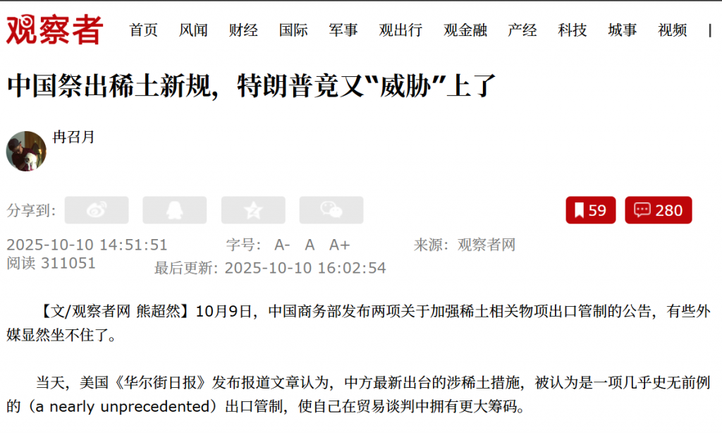 中共观察者网刊文《中国祭出稀土新规,特朗普竟又“威胁”上了》以美之道还治其身