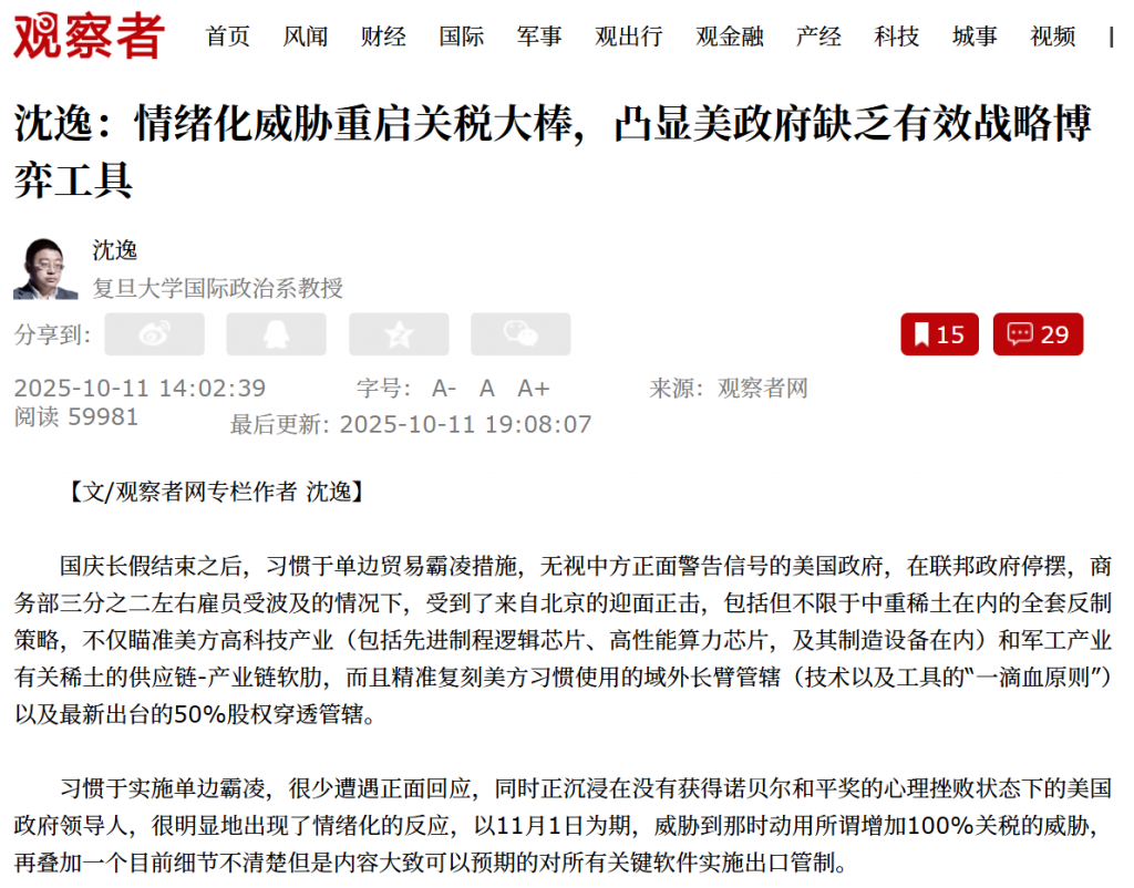 中共观察者网刊文《沈逸:情绪化威胁重启关税大棒,凸显美政府缺乏有效战略博弈工具》
