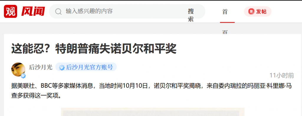 中共观察者网《这能忍?特朗普痛失诺贝尔和平奖》