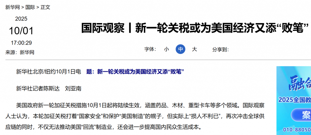 中共新华社刊文:《观察丨新一轮关税或为美国经济又添“败笔”》