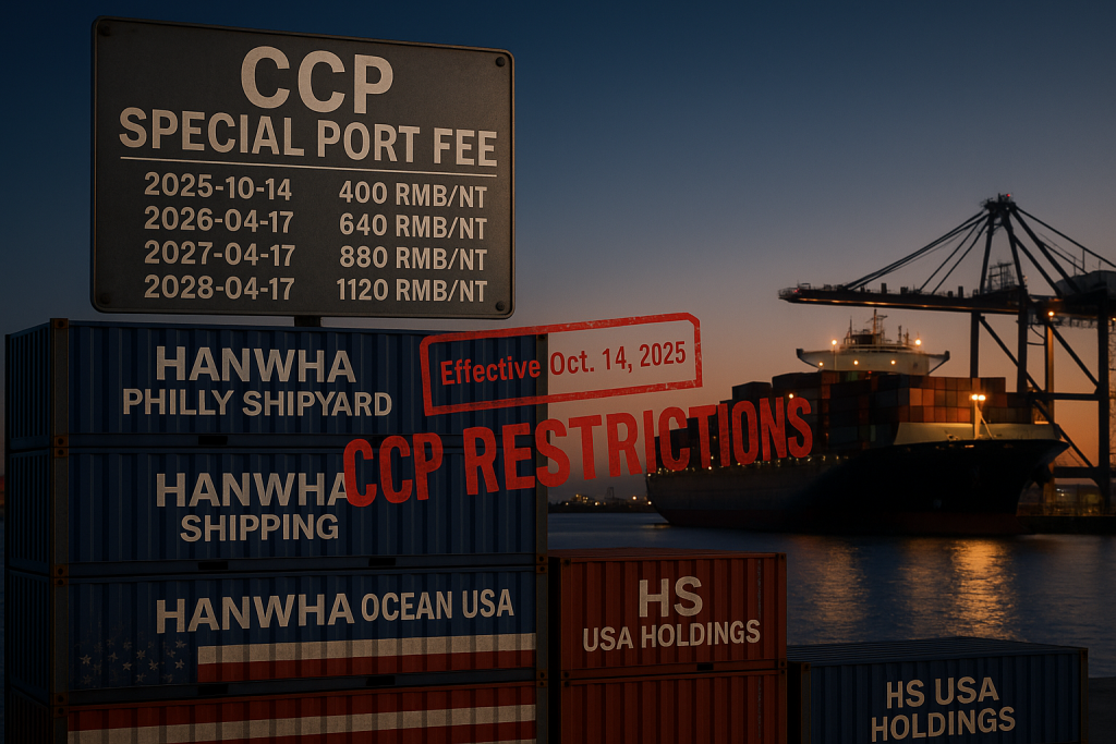 2025年10月14日,中共交通运输部先行发布并征收对美船舶特别港务费;随后,中共商务部公布对韩国船舶公司韩华海洋在美国的5家关联子公司采取限制措施。两项举措同日生效。