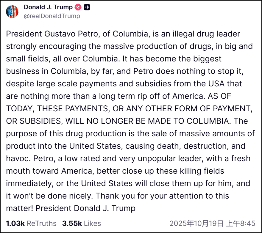 哥伦比亚总统古斯塔沃·佩特罗,是一名非法毒品头目,强力鼓励在哥伦比亚全国各地、大大小小的田地里大规模生产毒品。毒品生意已远远成为哥伦比亚最大的产业,而佩特罗对制止此事无所作为,尽管美国提供了大规模的款项与补贴,但那不过是对美国的一场长期盘剥。自今日起,美国将不再向哥伦比亚提供这些款项,或任何其他形式的付款或补贴。此类毒品生产的目的,是将海量毒品销往美国,造成死亡、破坏与混乱。佩特罗这位评价低、极不得人心、对美国出言不逊的领导人,最好立刻关停这些“杀戮之地”,否则美国会替他关停,而且不会客气。感谢您对此事的关注!