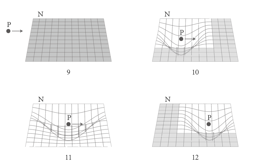 如图9假设存在一个平面N,在这个平面外存在事件奇点P,因为是平面关系,时空粒子不在此区域运动,且四维空间无法通过时空粒子观测到该平面;如图10事件奇点P位移使平面发生扭曲,颜色标记部分因为是平面,所以时空粒子无法在该区域运动,四维空间中无法通过时空粒子观测到该区域;然后事件奇点P位移至图11位置,平面N的细分面都有发生扭曲,所以这些扭曲的面都能被四维空间通过时空粒子观测到,事件奇点P继续位移至图12的位置,同样,颜色标记部分为平面,时空粒子不在这范围运动,四维空间中无法通过时空粒子观测到该部分。