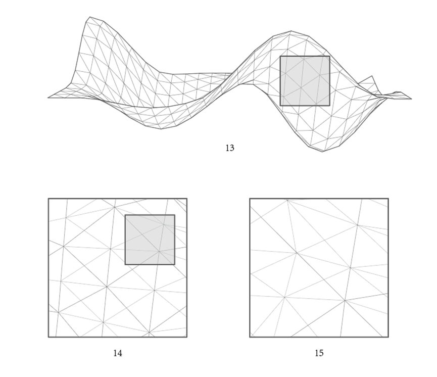 如图13,我们将框选区域进行放大,得到图14的细分面,然后我们继续放大图14中的框选部分,我们会看到图15中,图14被框选部分的细分面。所以无论怎么分,最终也会是平面,所以时空粒子能读取的信息,只有这些面变化的瞬间。