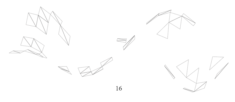在我们三维空间中,我们观测到的图13不规则平面,通过时空粒子将信息传到四维空间中可能是一些不规则且不相连的面信号,而且这些信号都是瞬间出现然后消失的。如图16所示,如果面不断在变化,且驱动不规则面变化的事件奇点也不断运动,四维空间中最终会将这些消失,出现,消失,出现……的细分面的相关所有信息转译为四维空间中的信息。