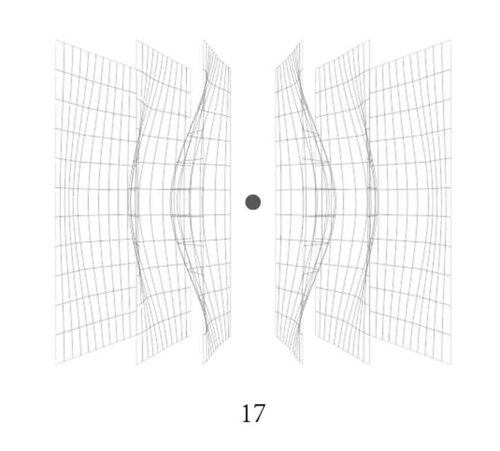 如图17,事实上,不规则面是一层层的,如图17,这些面会受到事件奇点的影响,发生扭曲,因为最早的宇宙事件“始无”到“终无”,我们也可以简单理解为因果,这些事件奇点会不断运动,直至关联的事件奇点重合并消失,所以四维空间观测这部分信息也会不断地变化,且最终转译成四维空间的信息。