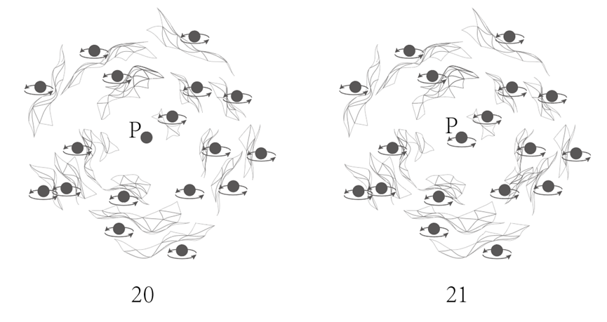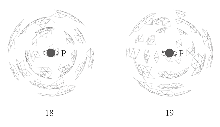 如图20,假设存在事件奇点P,假设在事件奇点P周边存在着许多的事件奇点,此时,P没有在运动,但周围的事件奇点却在运动,且刚好落在事件奇点P所扭曲的不规则面上,这时候,就算P没有在运动,但因为其他事件奇点的影响作用下,导致没有运动的事件奇点P也能被四维空间通过时空粒子观测到。如图21,假设事件奇点P与周围的事件奇点同时在运动,而事件奇点P运动过程中,所扭曲的不规则面,刚好全部被周围的事件奇点所影响和发生扭曲,最终在这情况下,虽然P所扭曲的不规则面一直存在,但受周围其他的事件奇点影响,这些面都被其他事件奇点所扭曲,这种状态下,事件奇点P在运动,周围的事件奇点也在运动,但是四维空间通过时空粒子无法观测到P点的存在。因此我们可以通过许多事件奇点在三维空间中进行特定的运动方式,来改变事件奇点P在四维空间中的观测状态,显示与消失;而这个可以通过三维运动方式对信息进行四维转译的事件奇点,我称其为“时空锚点”。