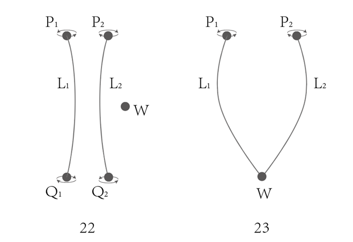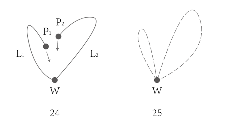 如图24,如果不给P1、P2施加任何外力,且不受任何其他事件奇点的影响情况下,时空锚点P1、P2将发生“奇点回归”现象,最终P1、P2将与黑洞W重合,与之关联的事件之弦L1、L2将会消失。