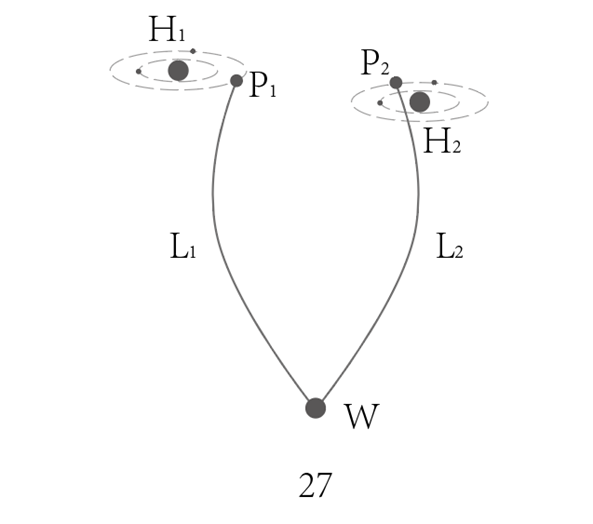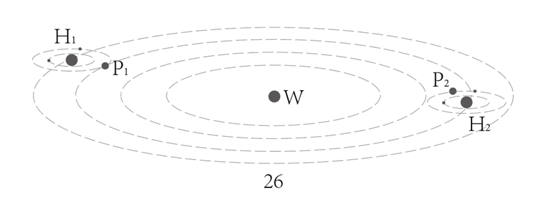 如图26,假设存在H1、H2两颗恒星,且两颗恒星受黑洞W的影响,环绕黑洞W运动。时空锚点P1受恒星H1影响,绕恒星H1公转运动;时空锚点P2受恒星H2影响,绕恒星H2公转运动。假设H1、H2最终将会形成稳定的事件奇点,黑洞,而两个黑洞最终会与黑洞W结合。
