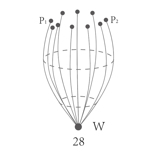 如图28,黑洞W因为与全视观测点的观测点重合,所以其必定与很多的事件之弦连接在一起,也可以理解为与无数的因果关联,所以这些事件之弦必须将事件奇点与黑洞W重合才能消除;而其中的时空锚点P1、P2与之连接的事件之弦因黑洞W关联起来,因为三维宇宙中的事件奇点(量子)以及对应的事件之弦非常混乱且充满随机性(关于随机性下文会提及),所以我们可以将时空锚点P1、P2,通过黑洞W重新组合成一条事件之弦,因此时空锚点P1、P2关联且连接在一起的事件之弦,在一些情况下我们可看作为一条事件之弦。