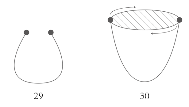 这时候我们需要回到事件之弦最初的状态,如图29,事件“始无”到“终无”,在第一维度中,证实了事件的存在;如图30,当两个事件奇点同时在一个二维平面上相互作用运动时,且他们都通过事件之弦连接,成为一个独立事件,事件的因果就可以互换。那么三维呢?三维事件的表现形式是什么?是创造,创造事件。