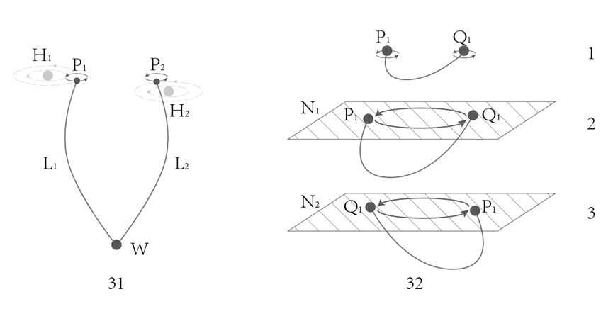 如图31,时空锚点P1在三维宇宙中以正物质正向运动,时空锚点P2以反物质反向运动。如图32-1,在三维空间中时空锚点P1以正物质进行运动,时空锚点Q1以反物质进行运动,P1与Q1通过事件之弦连接成为独立事件,这时候,我们将时空锚点P1转化为反物质进行运动,对应的Q1会转化为正物质进行运动;如图32-2,我们视角降到二维,假设二维空间N1上存在事件奇点P1和事件奇点Q1,P1与Q1通过事件之弦连接,是一个独立事件,三维空间中P1与Q1进行正反物质转换时,如图32-3,因为二维空间中无法看到P1、Q1在三维空间中作为正反物质运动,所以二维空间中事件奇点P1与事件奇点Q1互换位置。