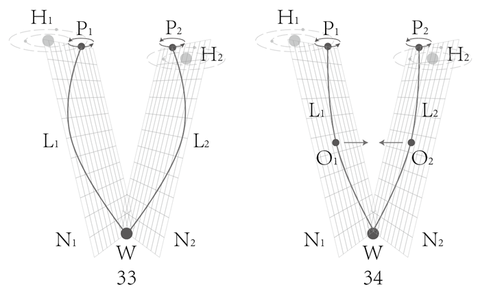 如图34,当时空锚点P1从正物质转化为反物质,时空锚点P2从反物质转化为正物质的时候,二维空间N1、N2上因为未发生事件奇点正反互换,这时候时空锚点P1与黑洞W相连的事件之弦L1,和时空锚点P2与黑洞W相连的事件之弦L2,会发生变化。变化后的事件之弦L1与二维空间N1产生事件奇点O1,变化后的事件之弦L2与二维空间N2产生事件奇点O2,事件奇点O1与02相互吸引,相互靠近。