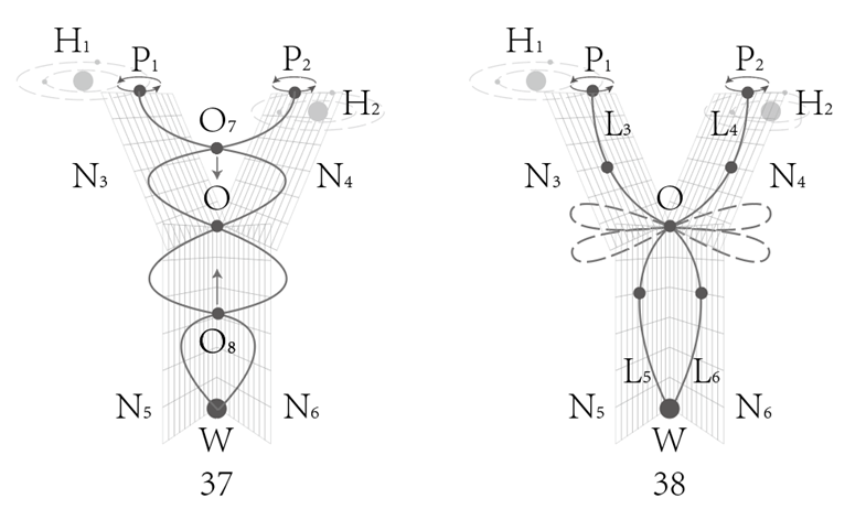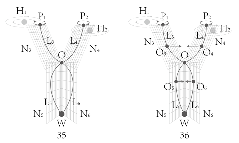 如图35,由于时空锚点P1、P2对应的事件之弦L1、L2与全视观测点重合观测的黑洞W相连,我们这时候可以将L1、L2看作一条整体的事件之弦,事件奇点O1、O2最终将于重合在一起,形成新的事件奇点O;这时候,原来两个二维空间N1、N2将变化成N3、N4、N5、N6四个二维空间,他们分别对应着事件之弦L3、L4、L5、L6。时空锚点P1与事件奇点0由事件之弦L3连接,时空锚点P2与事件奇点0由事件之弦L4连接;事件奇点0分别通过事件之弦L5、L6与黑洞W连接。如图36,时空锚点P1、P2继续进行正反物质转换,这时候,事件之弦L3在二维空间N3上形成事件奇点O3,事件之弦L4在二维空间N4上形成事件奇点O4,事件之弦L5在二维空间N5上形成事件奇点O5,事件之弦L6在二维空间N6上形成事件奇点O6。事件奇点O3、O4相互吸引靠近,事件奇点O5、O6相互吸引靠近。