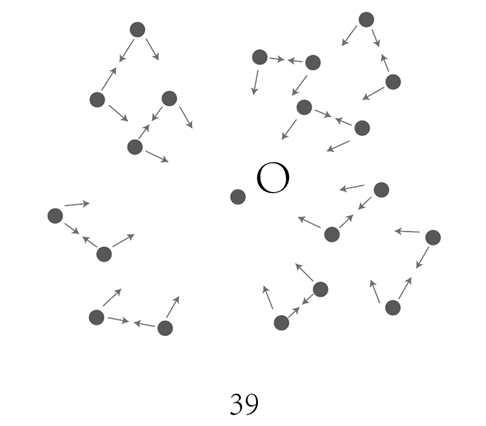 如图39,我们视角回到三维宇宙空间中,当时空锚点P1、P2不断地进行正反物质的转换时,在三维宇宙空间的某处,事件奇点0的附近会不断出现两个…两个…成对的事件奇点,然后这些事件奇点刚刚出现就快速结合并且全部往中心的事件奇点O靠近并且最终重合。如果时空锚点P1、P2所围绕公转的恒星未演变成黑洞,并且与全视观测点的观测重合,最终与时空锚点P1和P2重合。那么这种不断成对的事件奇点出现和结合的过程将一直在持续,这时候我们将得到了一颗全新的恒星。
