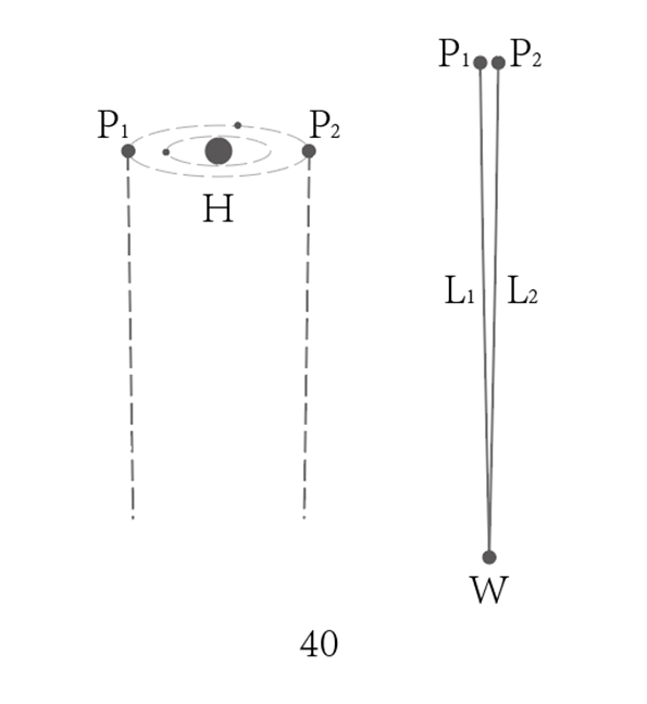 上文提及时空锚点P1、P2分别放置到两个环绕恒星公转的轨道上,那是为了更易于理解恒星的制作过程。如图40,其实时空锚点P1、P2最好就是围绕同一个恒星公转,这样时空锚点与黑洞所在的同一个二维空间的夹角会更小,这样制作一颗恒星的过程将会更快速和更稳定。