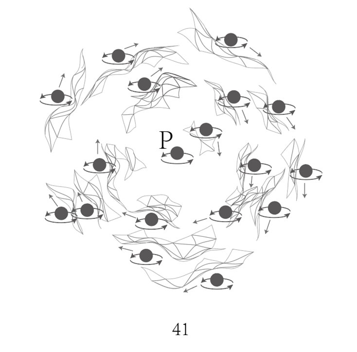 此时我们视角转到第四维度,如图41,时空锚点P由数量众多的事件奇点以三维的运动方式转化成四维的信号,每个事件奇点不但需要正反物质转换,并且需要以三维的形式不停地运动,这种运动必须非常精准且能改变时空锚点P在三维空间中影响的每个不规则面。因为时空粒子关系,这些事件奇点在三维宇宙中,我们看似无序,且随机性很强的运动,在四维中却是读取三维宇宙空间信息的必要过程。
