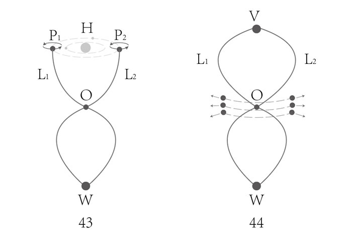因为本宇宙气泡中存在无数随机分布且无序运动的事件奇点,又因为这些事件奇点的运动,本宇宙气泡正在膨胀;而这些随机无序分布的事件奇点,是如何进行运动的,他们运动规律又是怎么造成的?如图43,时空锚点P1、P2分别围绕恒星H公转,时空锚点P1、P2不断进行正反物质转换时,成对的事件奇点产生,这些成对的事件奇点不断结合,从而形成恒星O。如图44,当恒星H形成黑洞V,黑洞V将与全视观测点的观测重合;然后时空锚点P1、P2与黑洞V重合,这时候恒星0将开始产生变化,恒星所产生的部分事件奇点开始按照时空粒子运动范围和四维空间的观测进行分布和运动,当然现在在我们看来这是无序的,但正因为这些事件奇点的运动与分布才有了我们如今的宇宙气泡。而最终,恒星O也会变成黑洞,周而复始……