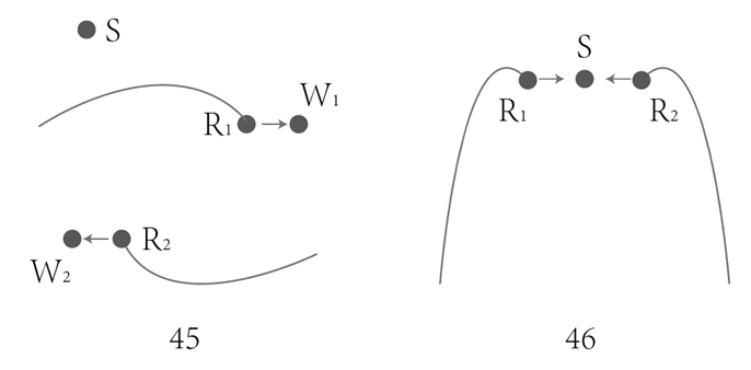如图45,假设存在W1、W2黑洞,且W1、W2黑洞是全视观测点S的观测点,S可以同时观测到W1、W2的所观测到的一切,假设存在事件奇点R1,R1通过观测并靠近黑洞W1;假设存在事件奇点R2,R2通过观测并靠近黑洞W2。如图46,理论上S可以同时观测到R1、R2;这时候我们自然会想,是否可以通过全视观测点S将信息通过黑洞W1、W2,将事件奇点R1、R2进行信息相互传输与接收。