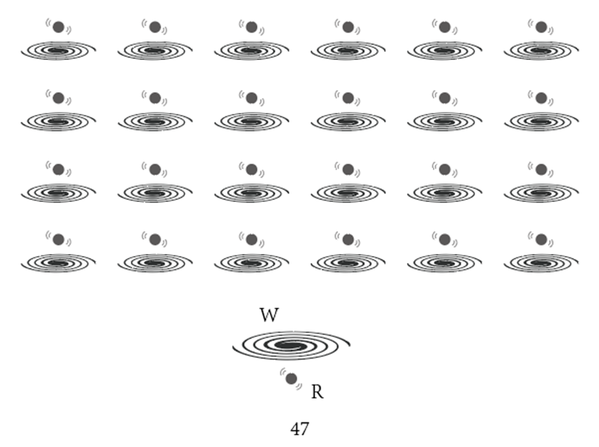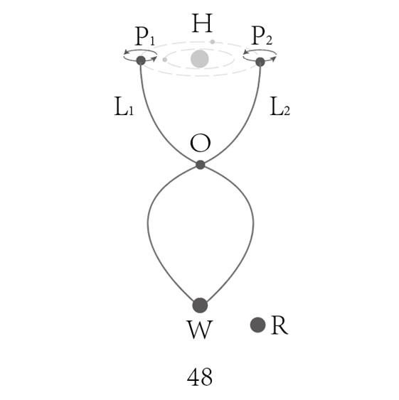 如图47,事实是,当引粒子R接近黑洞W时,同样有无数的事件奇点接近其他的黑洞。这些黑洞全部都是与全视观测点的观测重合的,所以引粒子R接近黑洞W得到的信息将是混乱的,那么如何可以实现将四维的信息转译为三维信息呢?