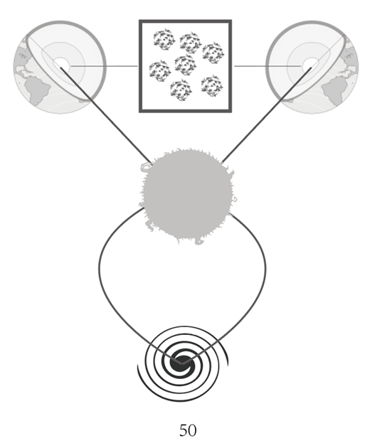 如图50,行星核心由无数的时空锚点组成,这些时空锚点又由许多事件奇点组成,并且通过事件之弦连接;两个行星核心中的所有时空锚点和组成他们的事件奇点,会不断地进行正反物质转化,最终在本宇宙气泡的某个位置形成一个新的恒星,并且两个行星核心与某个黑洞连接。