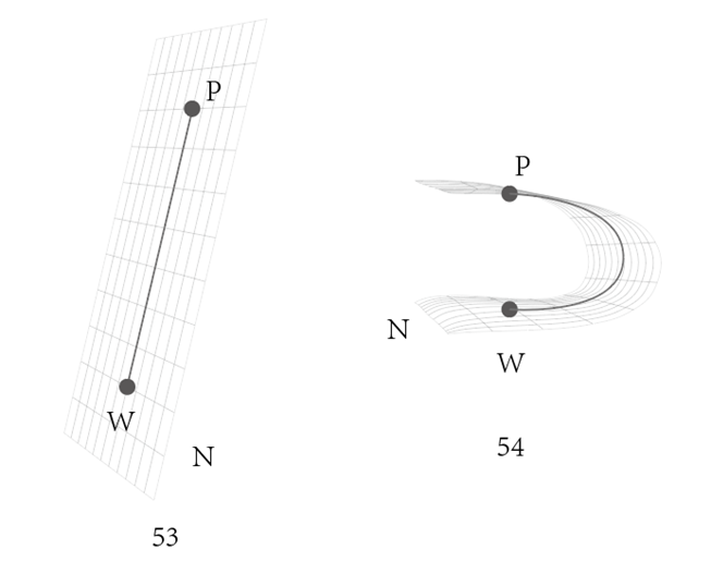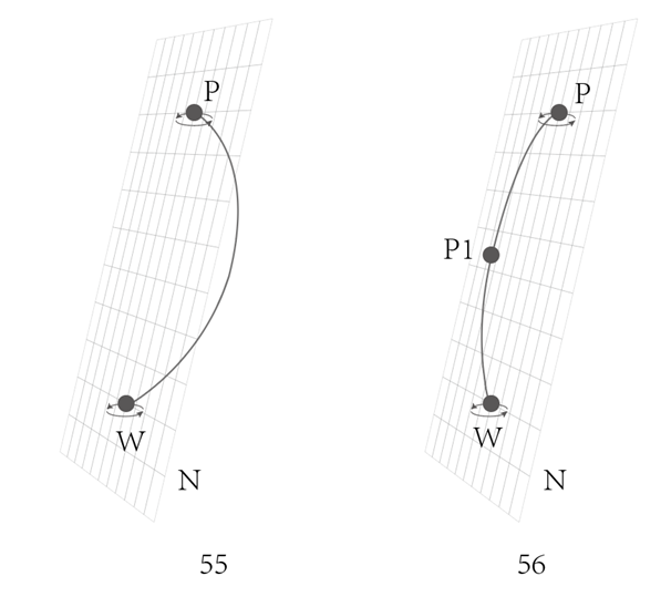 如图53-54,其实霍金也有在二维空间中看到了事件之弦,而且通过虫洞原理把面与弦进行同时进行扭曲。其实我们也可以将P、W进行正反物质转换从而实现类似虫洞的效果。但是我们有没有想过,其实我们可以使用P、W两个点,将平面N固定住,再让事件发生正反物质转换。