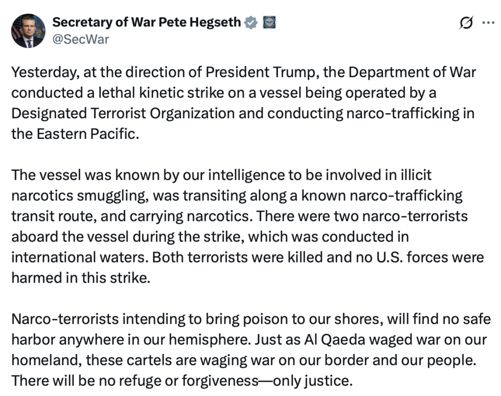 Today, at the direction of President Trump, the Department of War carried out yet another lethal kinetic strike on a vessel operated by a Designated…