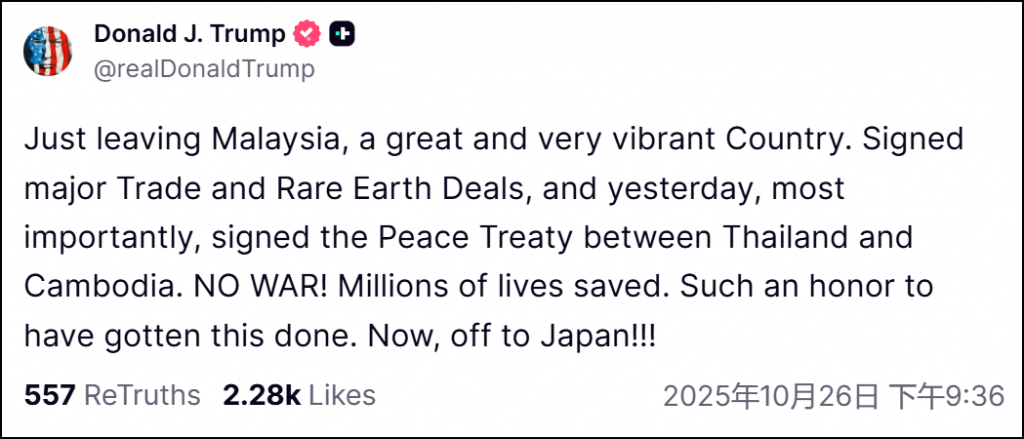 川普总统 TS:刚刚离开马来西亚,签署了重大的贸易协议和稀土协议,现在飞往日本!!!