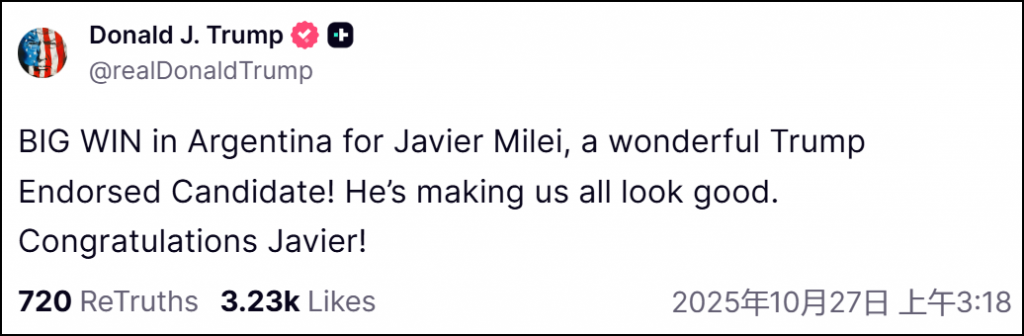 川普总统 TS:阿根廷出现了一个巨大胜利,献给哈维尔·米莱,这是一位得到川普背书的了不起的候选人!他让我们所有人看起来都很出色。恭喜你,哈维尔!