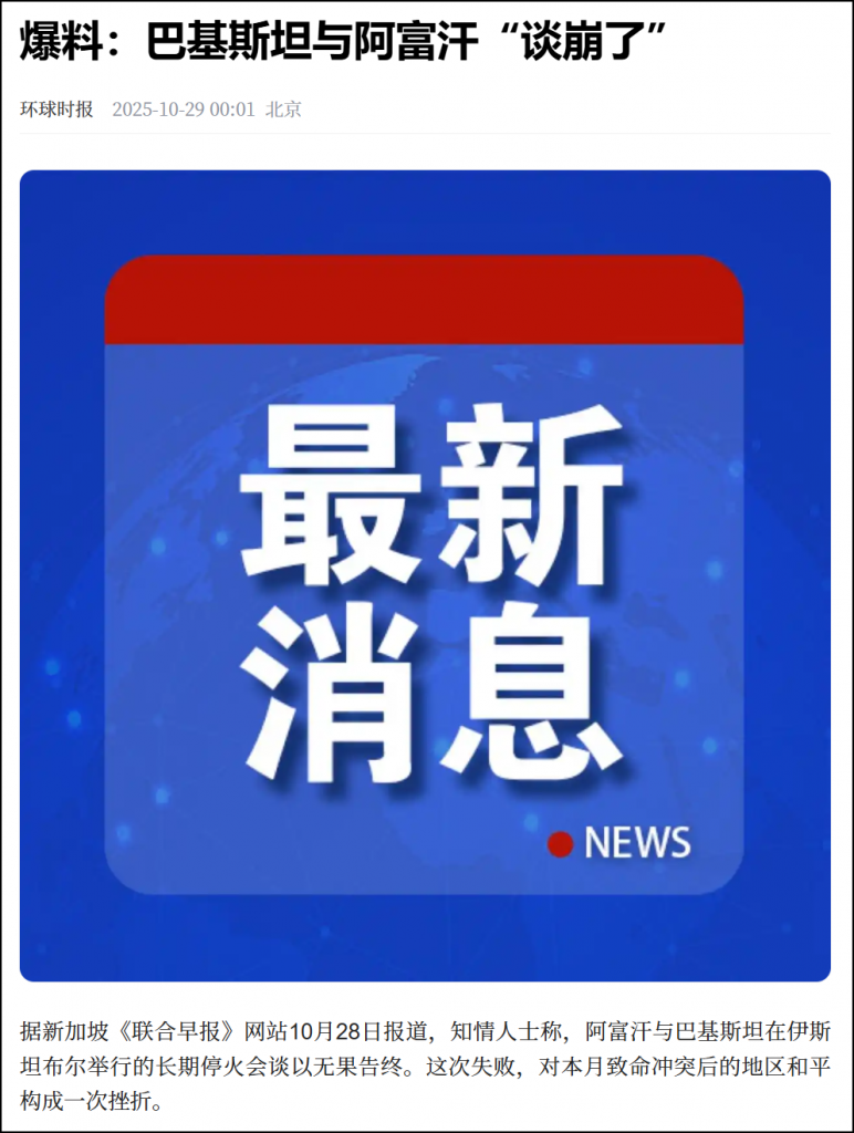 大陆时间,10月29日 凌晨 00:01。中共以【大字报样式-最新消息】+【爆料】刊登了《爆料:巴基斯坦与阿富汗“谈崩了”》的消息,如下图所示。