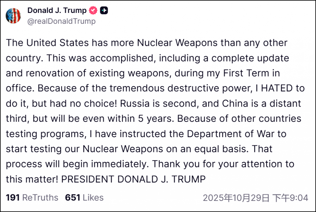 川习会前夕!川普总统 TS:我已下令战争部立即启动美国核武器试验